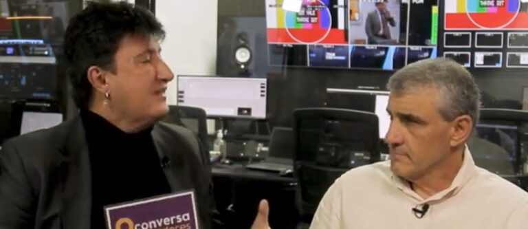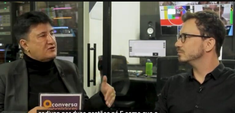 O apresentador Fabrício Correia recebe nos estúdios do SBT o economista e secretário de Governo de Jacareí, Celso Florêncio.